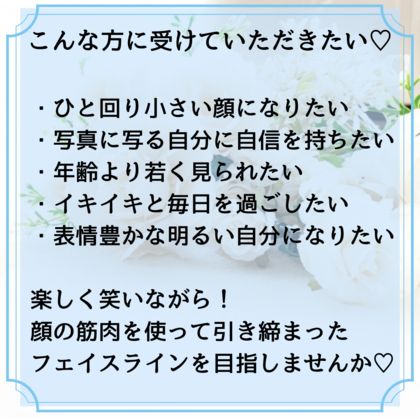 また、お顔だけでなく首や肩の凝りの解消にもなる動きも行なっていきますので,首周りもスッキリ!!